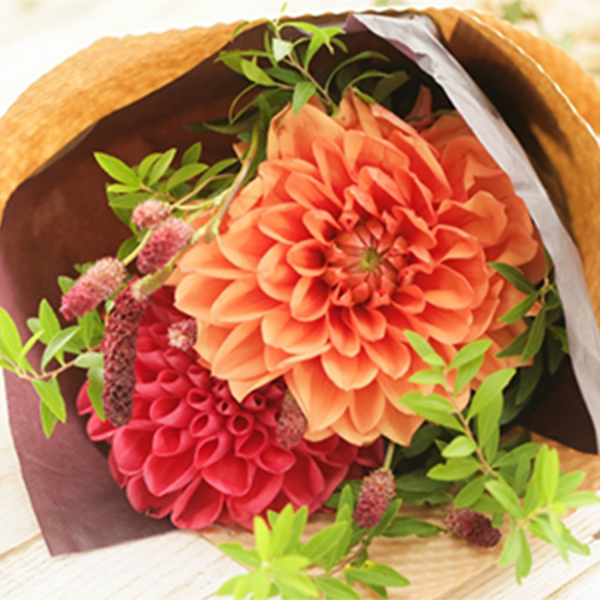 鮮やかな色彩と多彩な形状が特徴のダリアは、秋の定番です。特に深紅やオレンジのダリアは季節感を強調し、華やかさを引き立てます。存在感があり、ブーケやアレンジメントの主役にぴったりです。