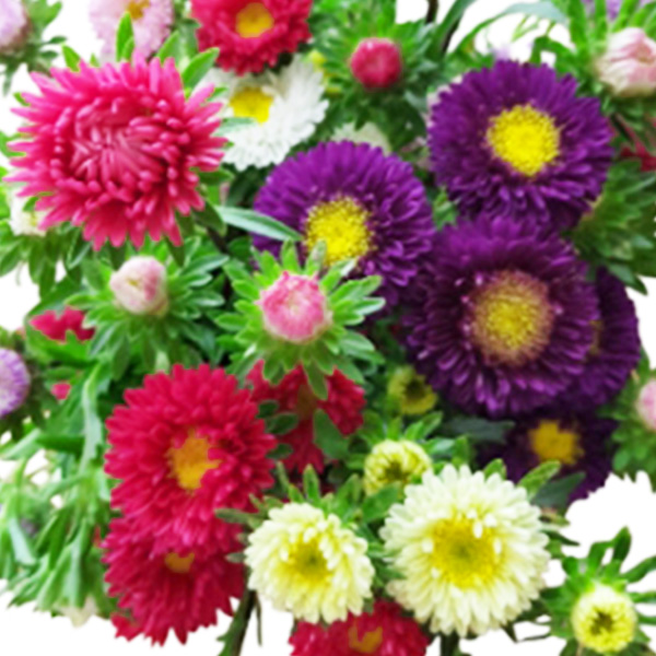 小さな星型の花を咲かせるアスターは、秋の庭を思わせる風情のある花です。紫やピンクの花が多く、柔らかい色合いがアレンジメントに優しい印象を与えます。
